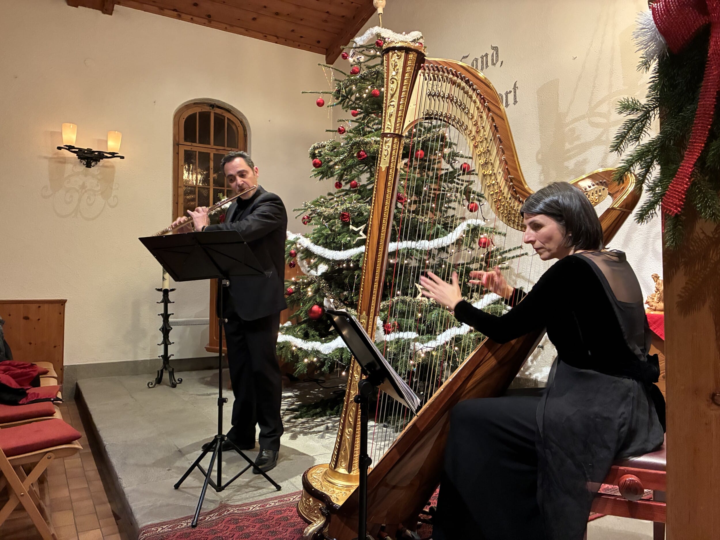 «Au clair de la lune» lautete der Titel des diesjährigen Festtagskonzerts im evang. Bergkirchlein auf der Lenzerheide am Samstagabend, dem 27. Dezember 2025. Der Mailänder Flötist Flaviano Rossi und die Harfenspielerin Elena Spotti, die im Mailänder Orchester «Pomeriggi Musicali» und in diversen Kammermusik-Formationen spielt, verzauberten das Publikum mit französischen Melodien